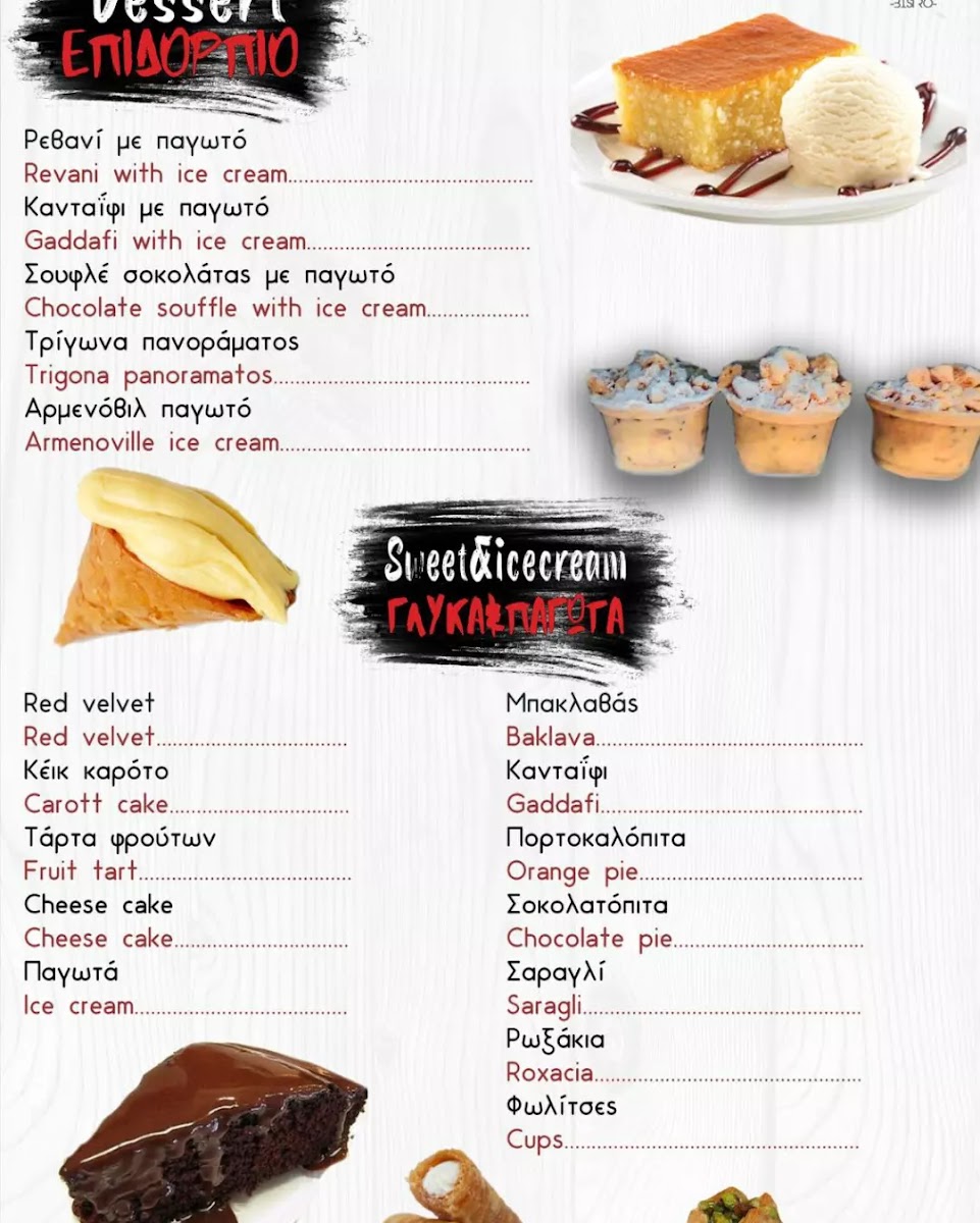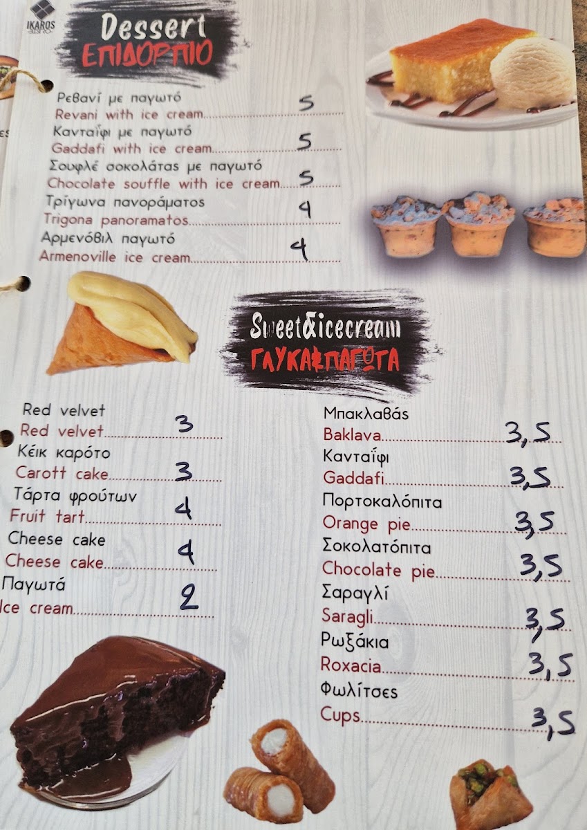 No meal is complete without dessert, and Ikaros Bistrot offers an array of delightful Γλυκα/desserts. These sweet treats are the perfect way to end your meal, with options that highlight the best of local flavors and indulgent confections.